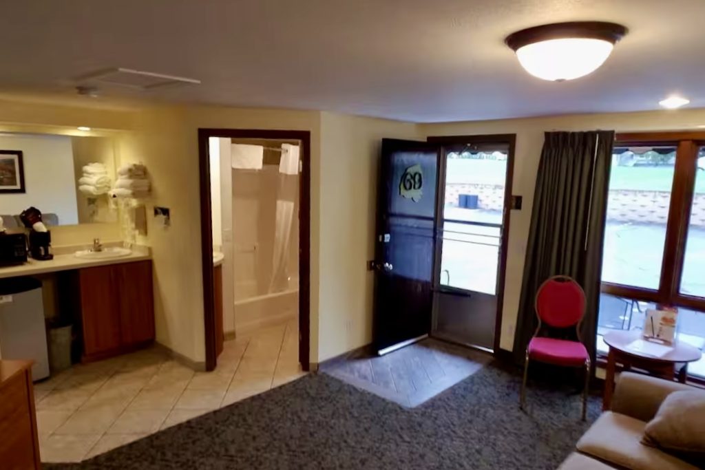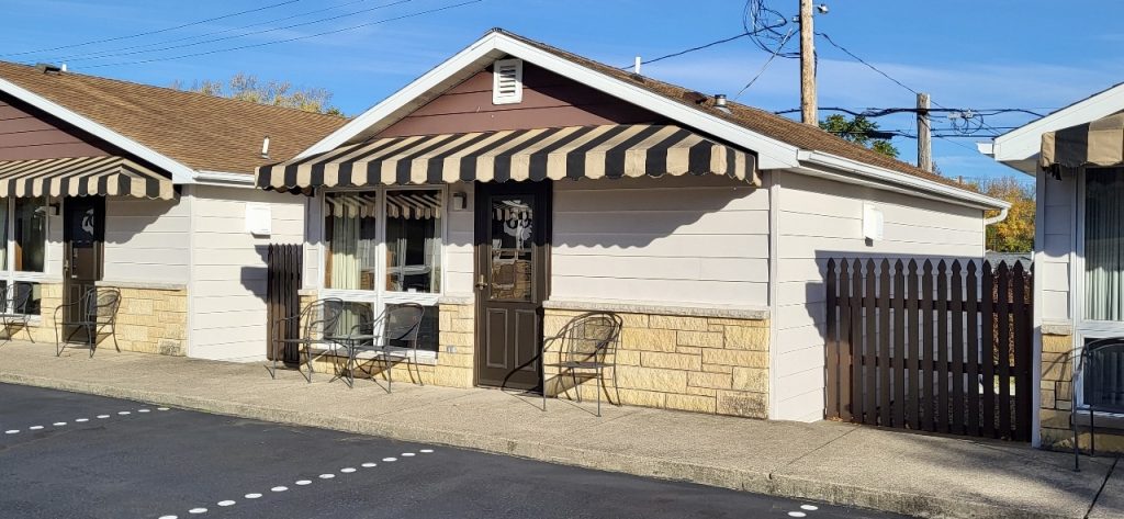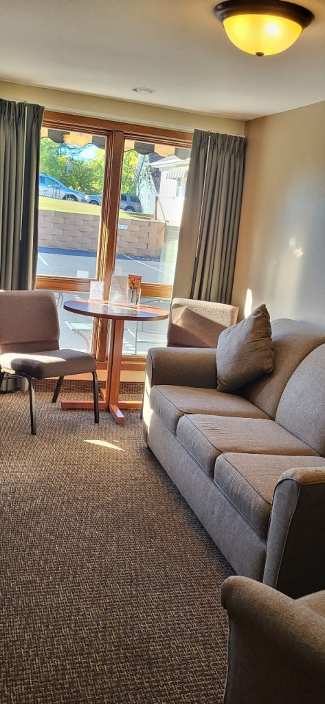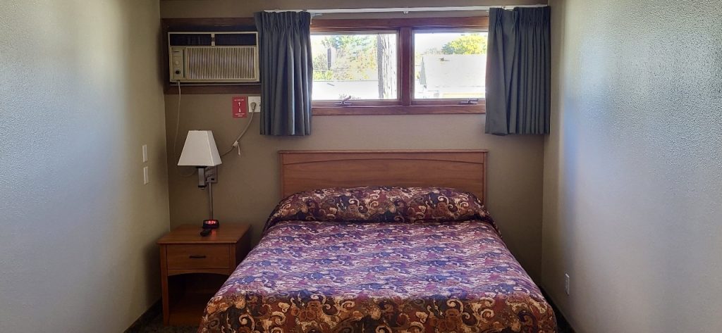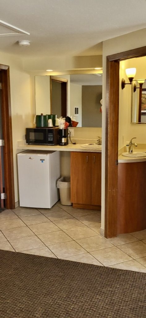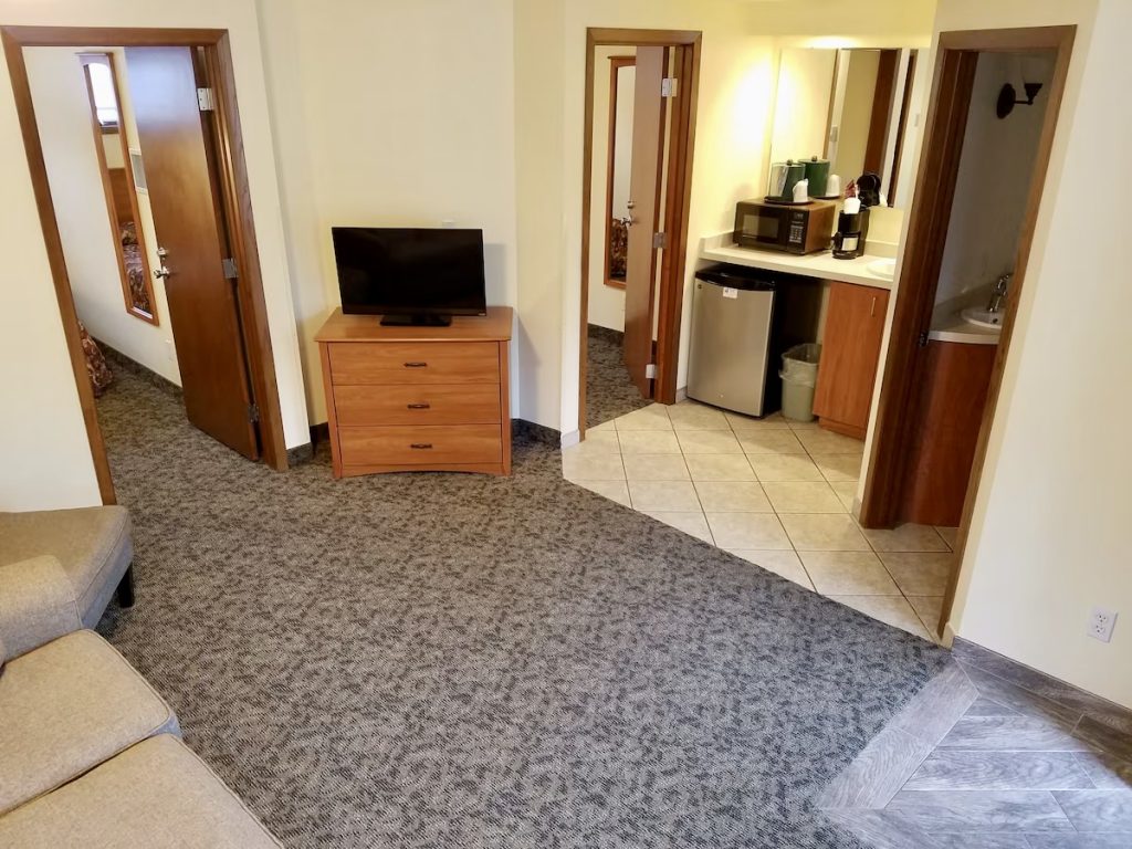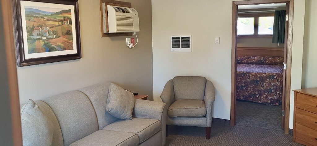 A great room choice for families that want privacy and a common area. Includes 2 separate bedrooms with a Serta Prestige Queen Bed, TV and AC / Heat in each bedroom. Front room includes a Queen size sofa sleeper, chair, table & 2 chairs, coffee table, flat screen TV and AC / Heat, as well as fridge, microwave, in-room coffee, hairdryer. Small complete bathroom w/ tub and shower, plus an additional outside vanity. This is an individual unit w/ no common walls, a very popular choice, just a short walk to our pools. Sleeps 2 – 6 guests, 460 sq. feet.