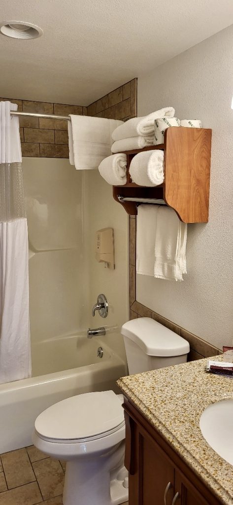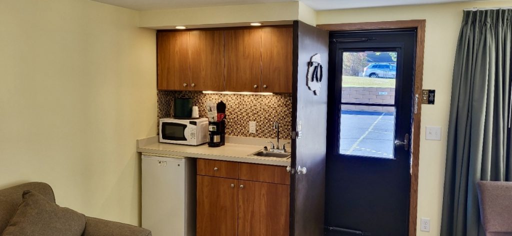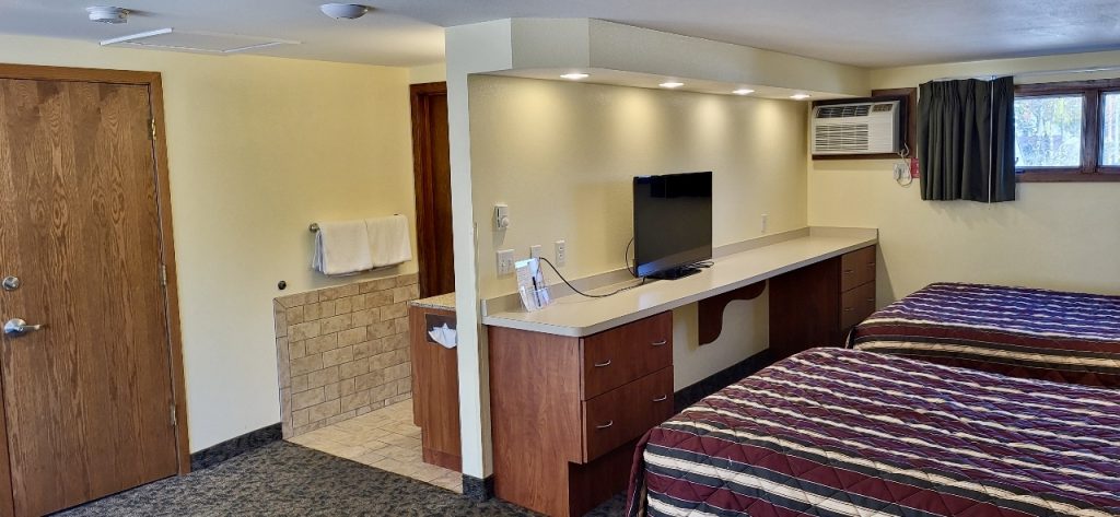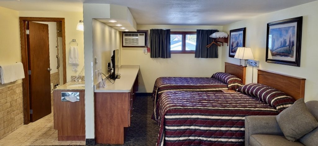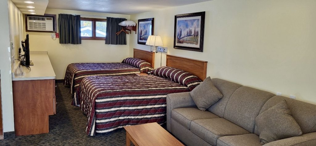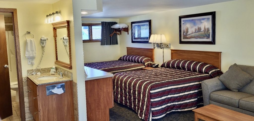 Great for larger families.  Includes 2 Serta Prestige Queen Beds and a Queen Sofa sleeper, full bathroom and additional outside granite vanity w/ hairdryer.  Includes fridge, microwave, in-room coffee, bar sink w/ countertop, kitchen cupboards for added storage, and 43″ TV.  A popular choice, all just a short walk to our pools.  May be rented adjoining w/ our two Queen Kitchen (#71, please call).  Sleeps 2 – 6 guests, 410 sq. feet.