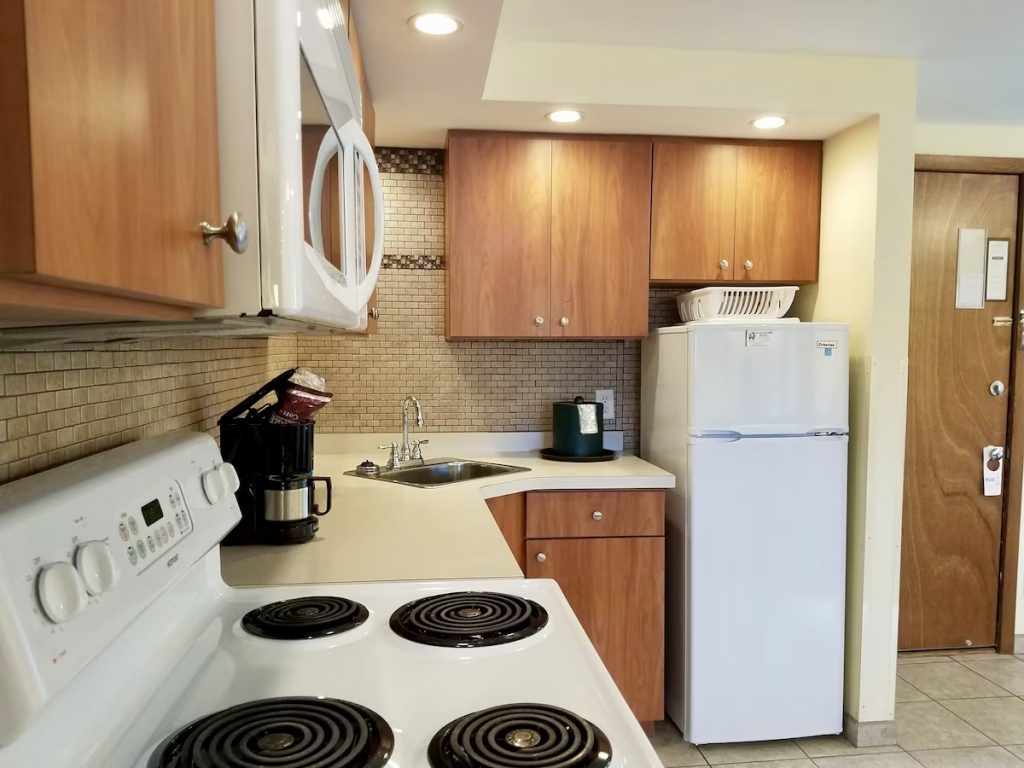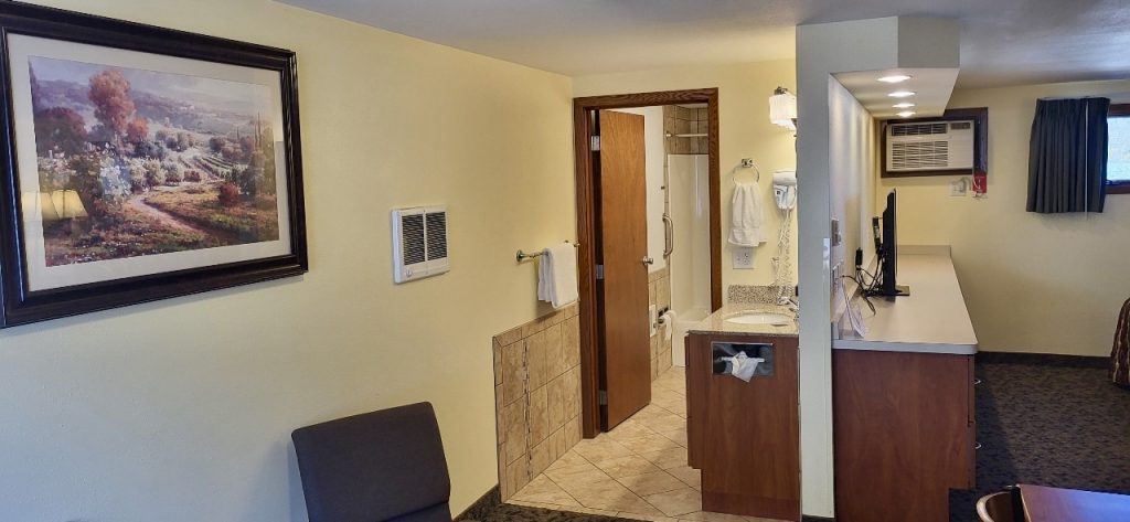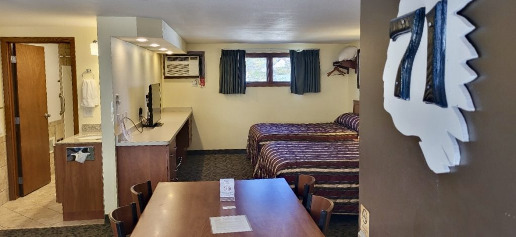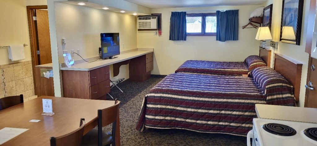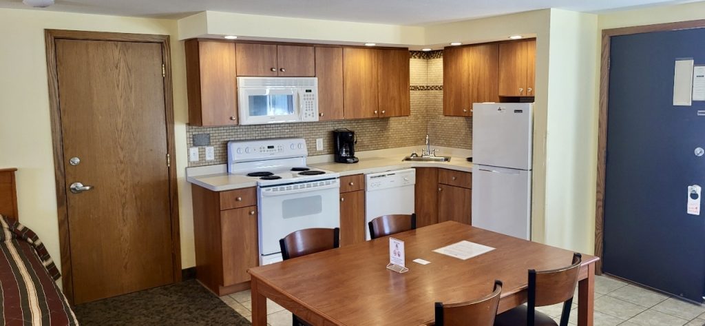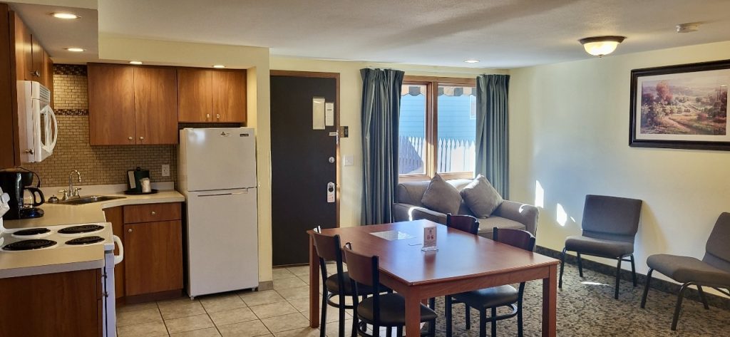 A popular favorite…2 Sealy Encore Plush Queen Beds, love seat and a complete kitchen. Includes 30” electric stove, dishwasher, microwave, apartment size fridge w/ small freezer, dishes, tableware, all your cooking utensils, table and chairs, plus picnic table. Just a short walk to our pools, all newly renovated, 465 sq. feet, sleeps 2-4 guests and may be rented adjoining w/ our 2 Queen Deluxe (#70).