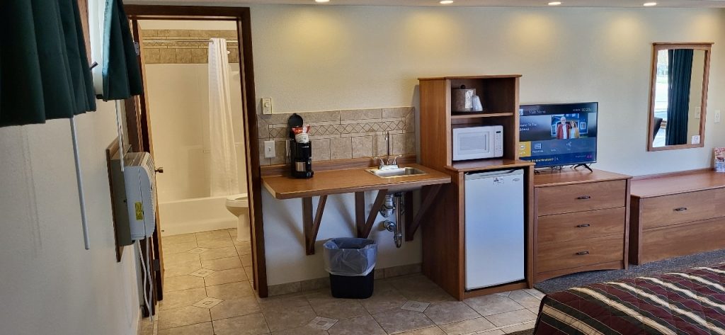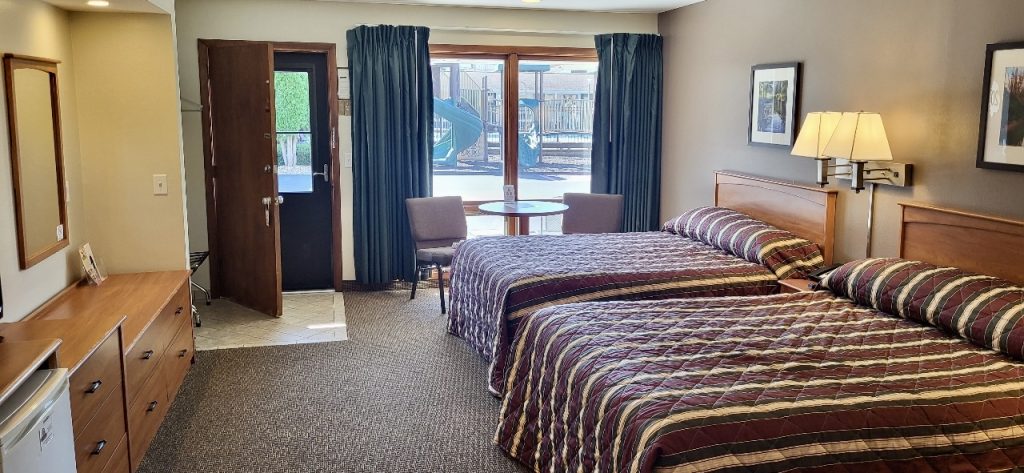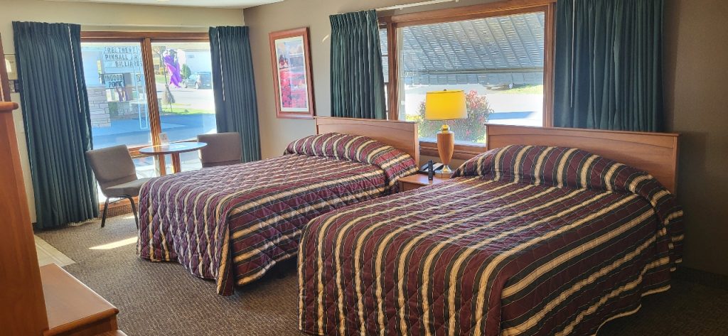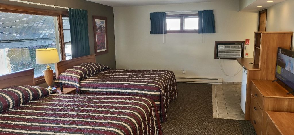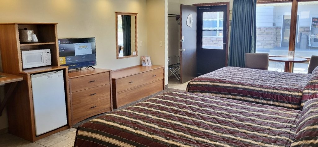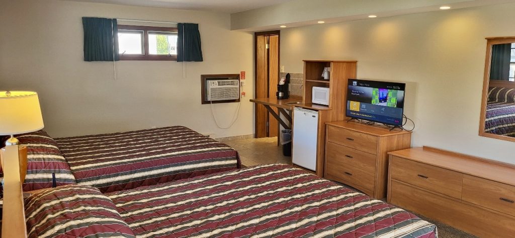Our largest of our motel rooms with 2 Queen Beds and some of our most requested rooms for many years.  Room includes Two Serta Prestige Queen Beds, 39” flat screen TV, fridge, microwave, bar sink w/ counter top, in-room coffee, vanity w/ granite top, hair dryer, table and 2 chairs.  Rooms 11, 15 and 16, sleeps 2-4 guests, 365 sq. feet. May be rented adjoining.