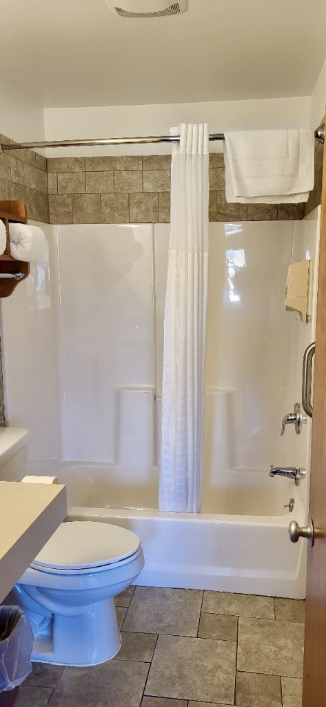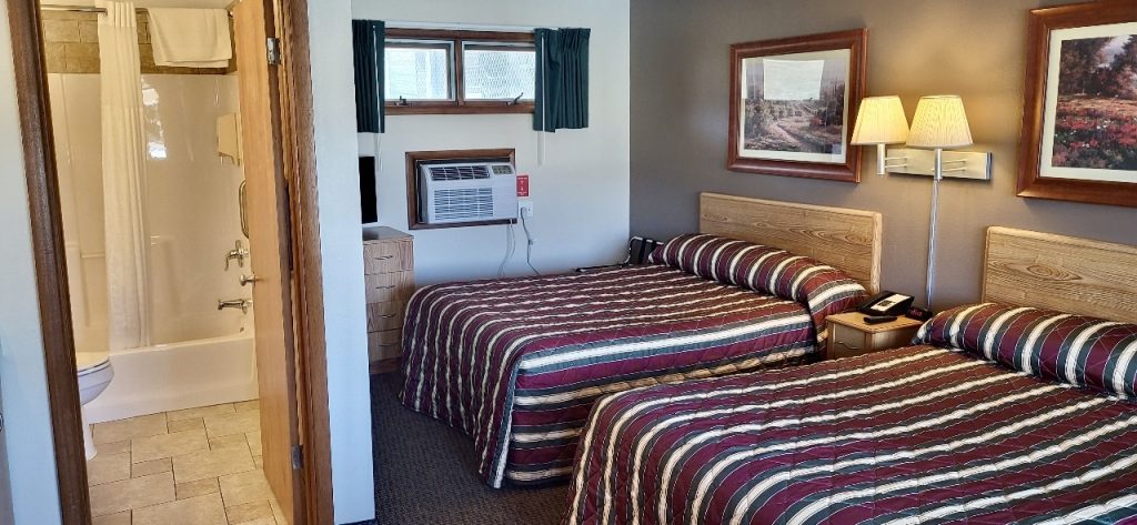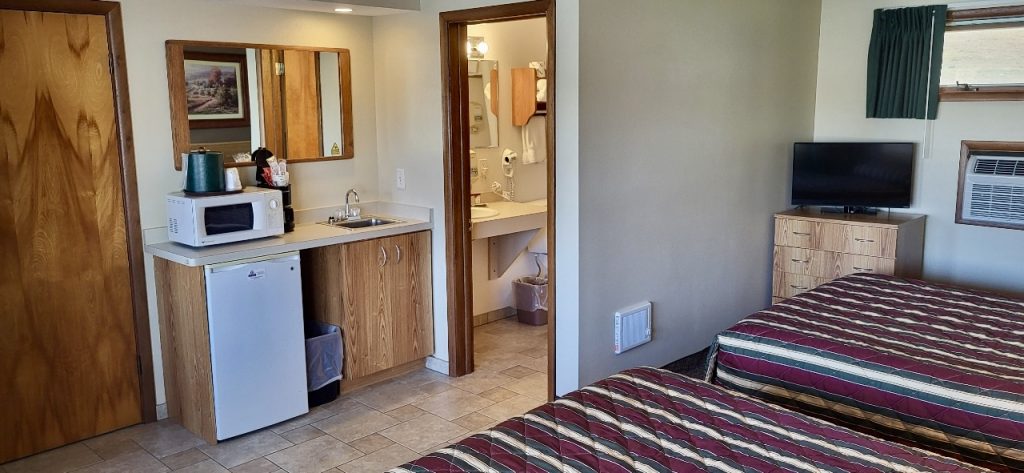 2 Serta Prestige Queen Beds, fridge, microwave, flat screen TV, hairdryer, in-room coffee, bar sink w/ counter top for extra storage, table and 2 chairs. All come with custom tiled entry way and located in our main “U” shape section on the left of our exit drive, rooms 51-58. A bit smaller room than our standard 2 Queen, sleeps 2-4 guests, 265 sq. feet.